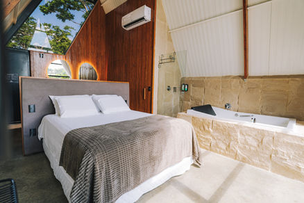 • Banheira de hidromassagem dupla com 20 jatos proporcionando uma massagem relaxante com vista pro lago